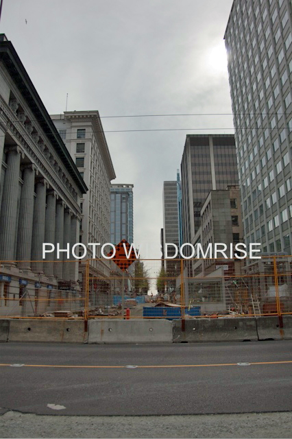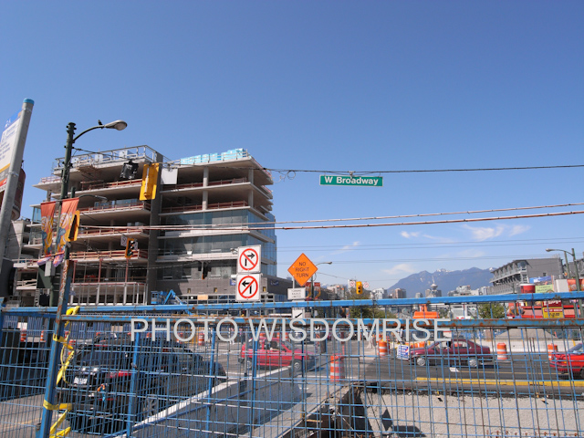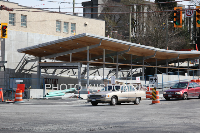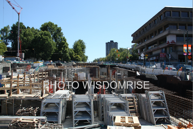 カナダラインの上を通るキャンビーストリート。 ブロードウエイとの交差点にある、 Broadway-CityHall Station 。2008 6 まだ大きな穴が見えています。