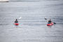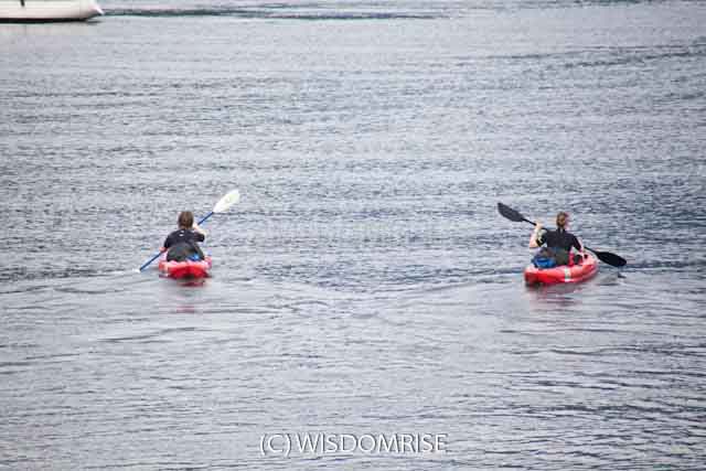 穏やかな水面はカヤックでにぎわっています。